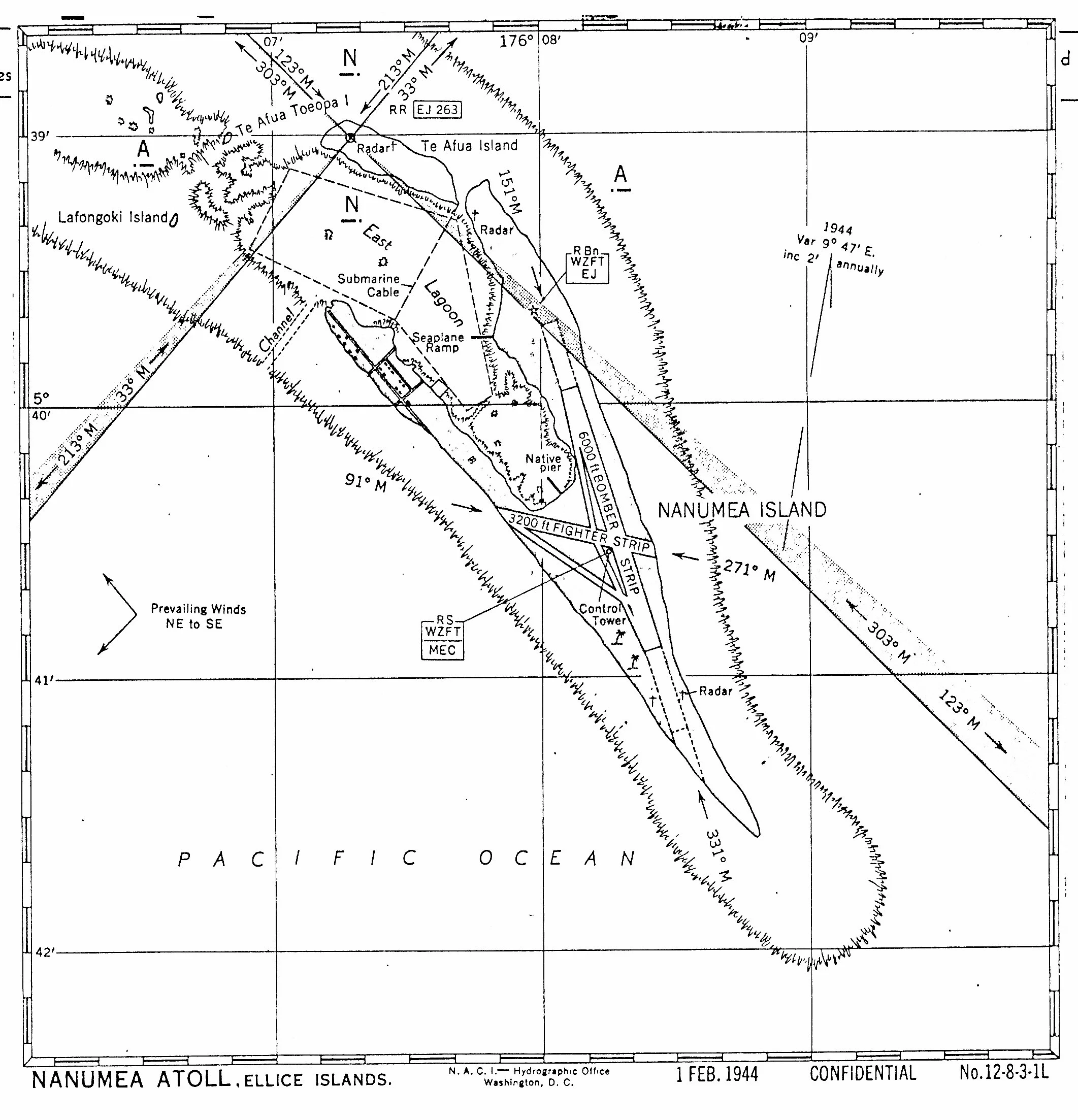 February 1944 — US Navy Hydrographic Office map showing Nanumea’s new airfield, the recently built pass into the lagoon, and many other features