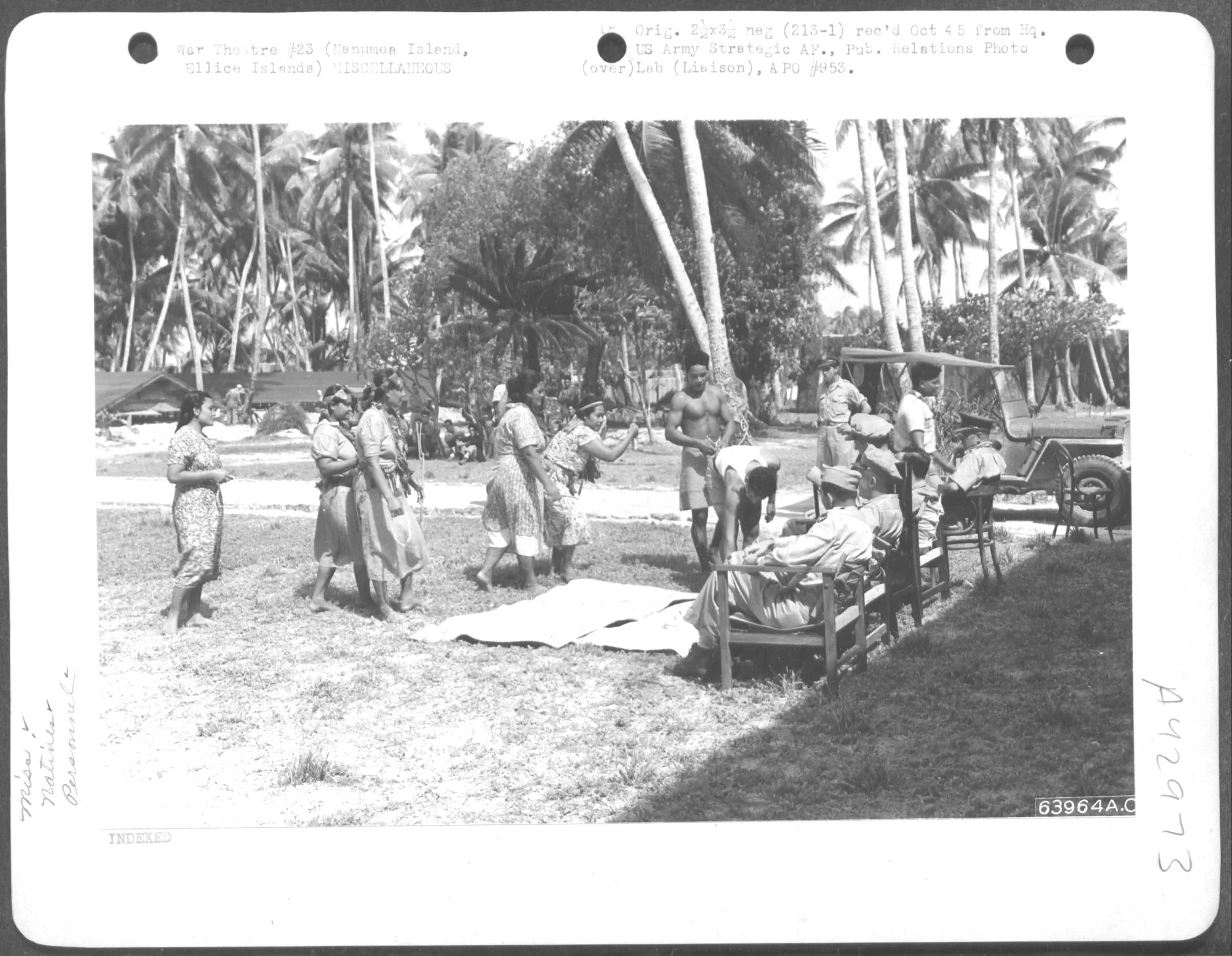 Welcome for Major General Willis Hale and staff, on his visit to Nanumea, 21 December 1943