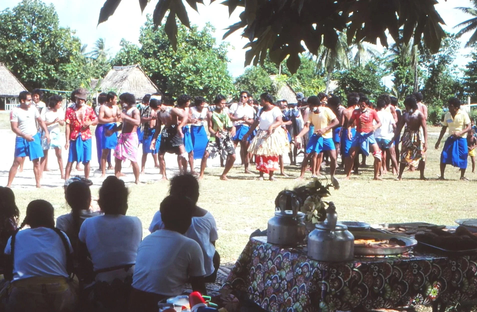 Spectators watch young fishermen dance after all-night fishing. Snacks and tea on table await the young men.